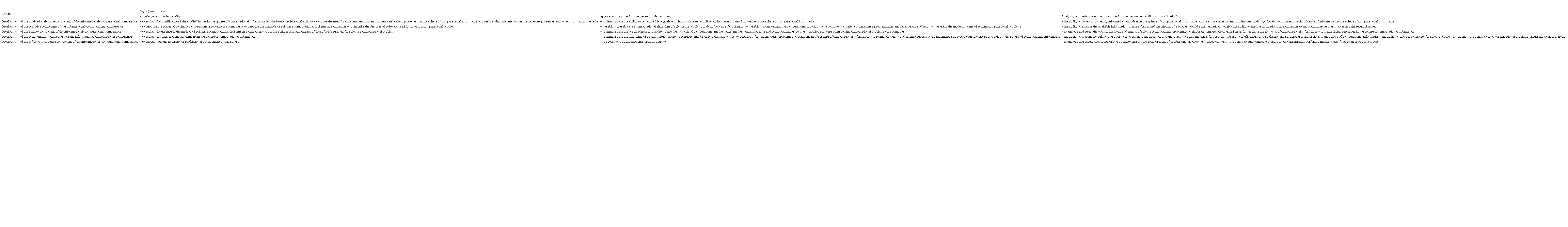 As the performed analysis shows, the said competence refers to special competence of an informatics teacher, developed within the disciplines of their subject training. Similar to the subsystem of the professional competence of an informatics teacher which includes such components of pedagogic activity as motivational-value, cognitive (“knowledge and understanding”), activity (“knowledge how to act”), communicative and reflexive-evaluative components (Bologna process…, 2006; “Pedagog” professional standard, 2017), the informational-computational competence has the structure consisting of five interrelated components: motivational-value, cognitive, activity, communicative and reflexive-evaluative, and is assessed by their manifestation efficiency in the process of solving the tasks of informational-computational activity.