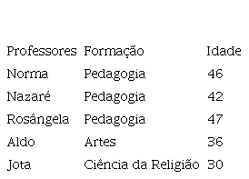 O grupo é predominantemente composto por pedagogas. Os outros professores atuam a partir do 6º ano do ensino fundamental com disciplinas que requerem a lotação em várias escolas para o preenchimento da carga horária. Entre as pedagogas, duas desenvolvem atividades nas séries iniciais: uma no turno da manhã e tarde, tendo uma turma em cada, e outra somente à tarde, com uma turma – pela manhã, na época da pesquisa, trabalhava em outra instituição escolar. Os professores de Artes e de Ciência da Religião assumem várias turmas, em diferentes espaços, em função da baixa carga horária das disciplinas.