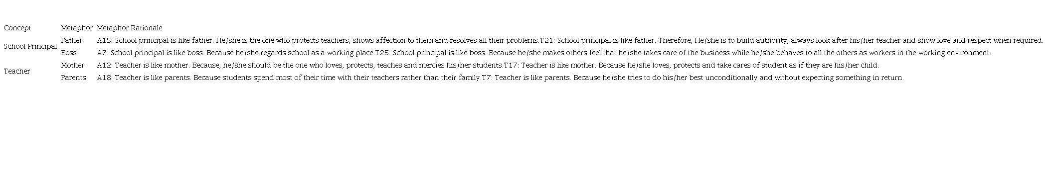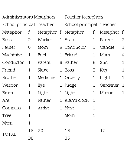 In Table 7, the usage frequency of the metaphors the participants used about the concepts of a school principal and teacher are expressed numerically. Because of the analysis of the metaphors created by 50 participants in total; 36 valid metaphors were reached for the concept of school principal and 37 for the concept of teacher. It was determined that both participant groups (administrators and teachers) in the study group likened the principal to the concepts of 'father' and 'boss' and the teacher to the concepts of 'mother' and 'parent'. Administrators and teachers give quotations from participant responses in Table 8 in order to more clearly conceptualize metaphors. These quotations are named with the names of A1, A2, and T1 and T2 for teacher responses, independent of the research, to ensure confidentiality of identity information.