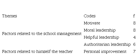 As can be seen in Table 9, it was seen that most of the administrators who answered this question under the theme of school management referred to the fact that the teacher should be more motivated by the principal in order to reduce the professional burnout of the teacher. Sample quotations for this situation are given below.