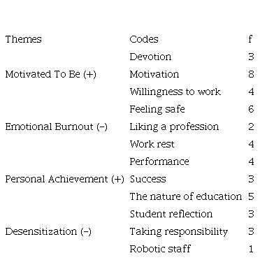 Because of the analysis on teachers' answers to this question, another remarkable finding was reached. The teachers said that the school principal's paternalist leadership style would decrease their emotional burnout and insensitivity and increase personal success. The emotional burnout, depersonalization and personal success themes seen in Table 10 represent the sub-dimensions of the Maslach Burnout Scale applied to the participants in the quantitative part of the research. Below are quotes from teacher responses representing each theme and sub-dimensions: