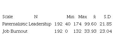 = 33.93. This finding revealed that the teachers' professional burnout was below the average value of 66.00. According to these results, it was determined that teachers' perceptions of paternalist leadership are above average, and professional burnout levels are below average.