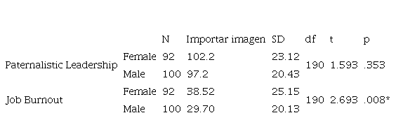 According to the analysis results given in Table 3, teachers' paternalist leadership perceptions [t (190) = 1.593, p> .05] do not show a significant difference according to gender variable. However, professional burnout levels [t (190) = 2.693, p <.05] differ significantly in favour of male teachers according to gender variable. The professional burnout level of female teachers is ( = 38.52) while the professional burnout level of male teachers is (