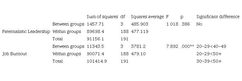Analysis results given in Table 4 [F (3,192) = 1.018, p> .05] show that teachers' paternalist leadership perceptions do not change significantly according to age. According to this result, the paternalist leadership perceptions of teachers do not differ significantly according to the age variable.