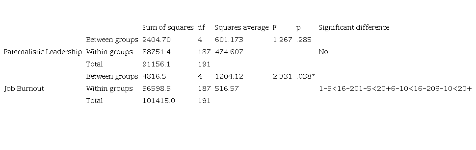The analysis results given in Table 5 [F (4,192) = 1.267, p> .05] show that teachers' paternalist leadership perception does not change significantly according to the year of study. Accordingly, it can be said that the paternalist leadership perceptions of teachers do not differ significantly according to the variable of the working year.The results of the analysis given in Table 7 [F (4,192) = 2.33, p <.05] reveal that professional burnout has changed significantly according to the working year. Scheffe test was carried out in order to determine between which groups the difference is. According to the test results the professional burnout of teachers with 1-5 years (=35.54) and 6-10 years (