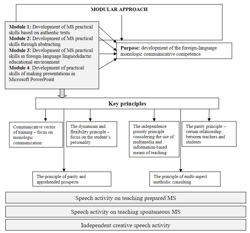 MS modular training is a module-based didactic system as a unity of students’ teaching and independent creative speech activity aimed at mastering the skills of monologic communication. Such system is built on the continuity of teaching MS and creates real conditions for the consistent development of students’ practical skills which are the main components of the foreign-language monologic communicative competence.