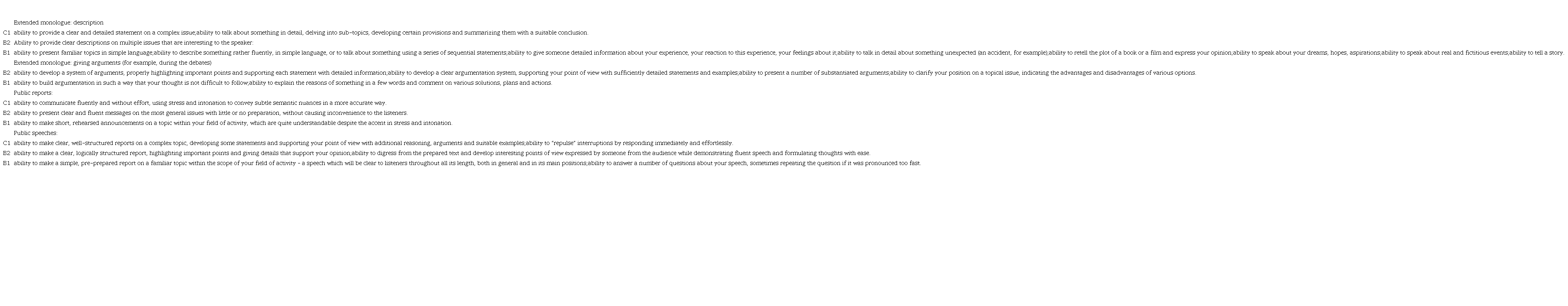 Let us turn to the level scale designed for speaking. Describing the MS proficiency levels reveals its relationship with dialogical speech, which, in our opinion, should be considered when developing modular programmes for teaching a foreign language to junior students of linguistic specialities.