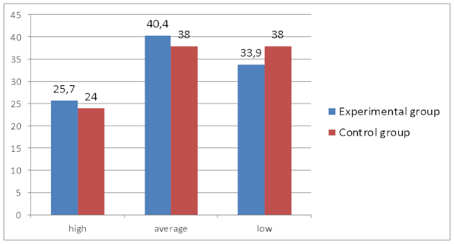 Comparing the x2emp with the critical value, we see that the characteristics of EG and СG coincide with the significance level of 0.05 due to the fact that the resulting value of x2emp = 0.59 < x2crit = 5.99. The case when χ2emp <χ2crit, it confirms the correctness of our hypothesis – the control and experimental samples are identical; the result χ2emp> χ2crit will mean that the distribution of students in the CG and the EG is statistically different.