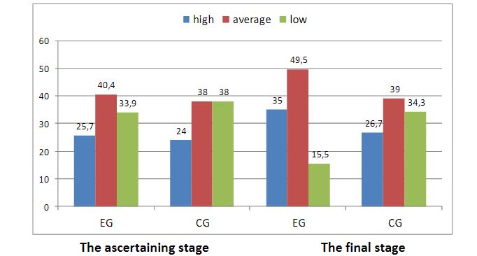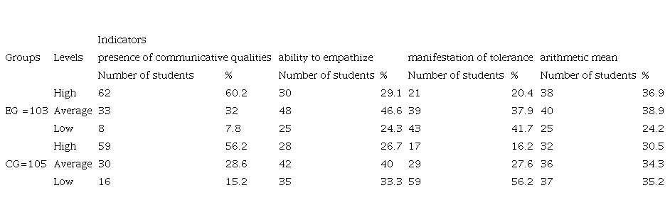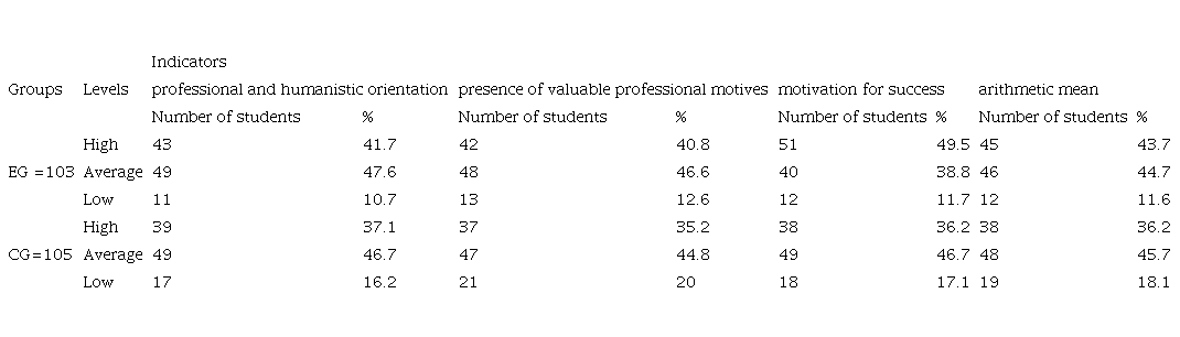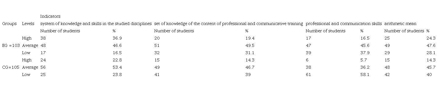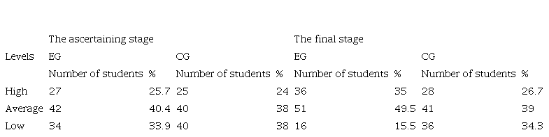 The reliability of diagnostic results at the ascertaining and forming stages of the experiment was carried out by conducting a statistical analysis of the obtained diagnostic data. The reliability of matches or differences in the number of points scored by students of EG and CG was determined by the criterion of uniformity χ2.