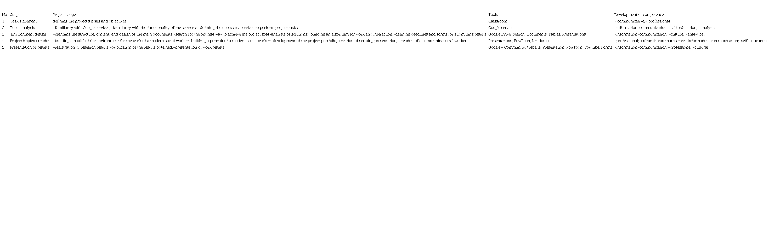 The technology of completing the project tasks provided for activities according to certain stages, as a result of which professional, communication, interpersonal, leadership, teamwork, and time management skills were developed. There were 5 stages of project execution, namely: task statement (1), tools analysis (2), environment design (3), project design (4), publication and presentation (5). Table 8 shows the stages of project implementation and the respective tools that are appropriate for each of them.