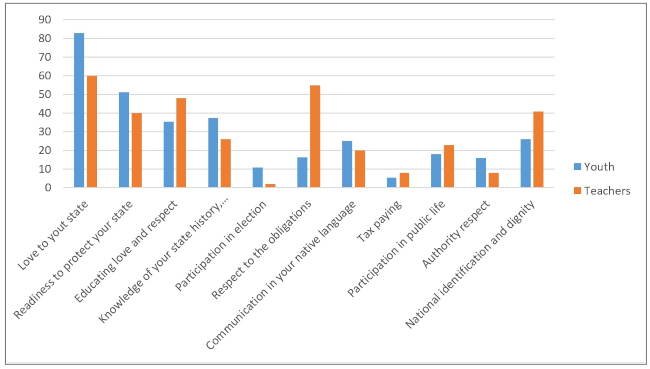Based on the results shown in Figure 1, we can argue that as for adults, the understanding of patriotism has more practical understanding, tied to a specific action, with deep responsibility for their actions. Young people associate "patriotism" more with the acquired theoretical knowledge, formed on their basis by moral principles. You should pay attention to the lowest indicators: payment of taxes, respect for the authorities, participation in elections – because they clearly characterize the civil position. At the same time, everyone's opinions coincide that "patriotism" is, first of all, love for the motherland. So, patriotic education at school should be imbued with love for the motherland and focused attention on the acquisition of specific competencies aimed at the realization of human rights and freedoms, education of civil responsibility.