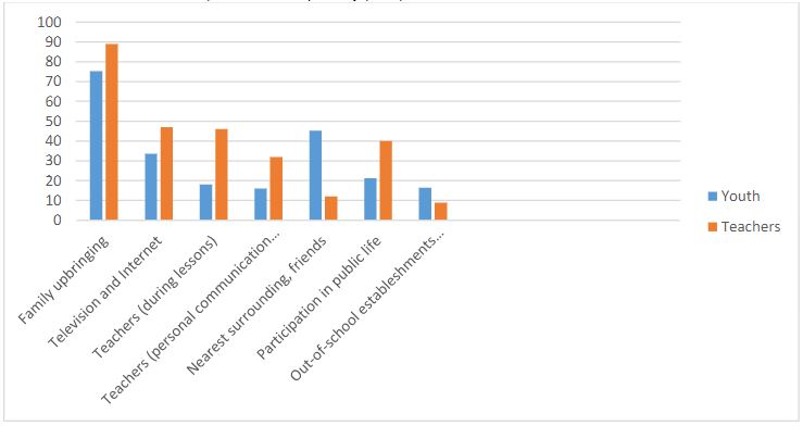 These diagrams confirm the decisive influence of family education and mass media on the formation of the civil position of young people. However, young people choose friends and extracurricular institutions as more significant form factors. This indicates a somewhat overestimated vision of teachers' influence on students. And this is an indicator of the urgent need of the educational system to move on to new relationships with young people, to make lessons even more emotionally insightful, trusting, modern, filled with interesting forms and methods aimed at acquiring competencies that will become useful in real life.