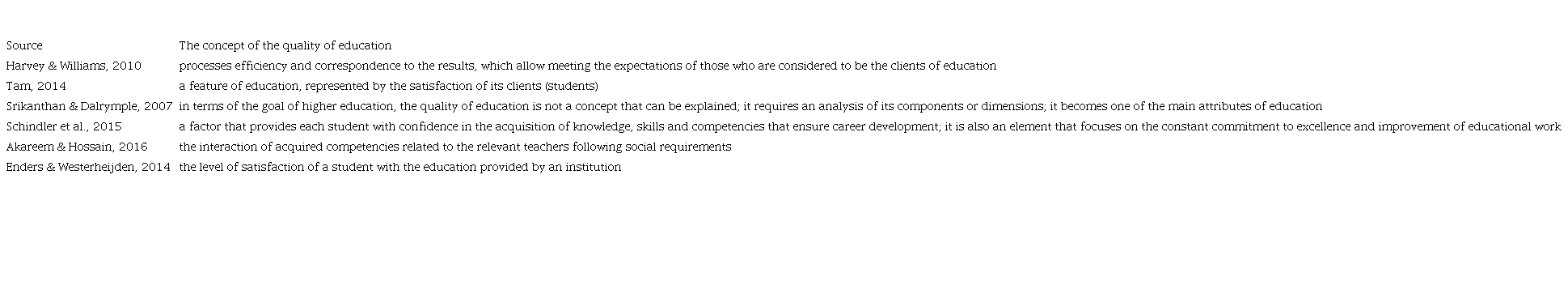 According to the researchers, the quality of education can help to measure the impact of higher education (Amaral & Rosa, 2010). There are various definitions of the quality of education (Table 1).