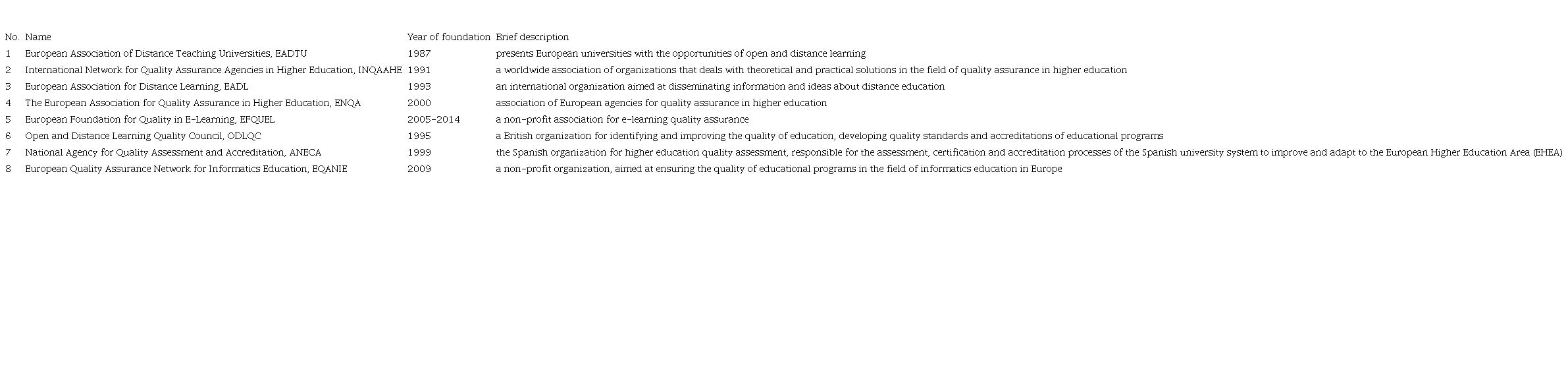 Until 2014, the European e-learning quality assurance organization was the European Foundation for Quality in E-Learning (EFQUEL), created with the support of the European Center for the Development of Vocational Training (CEDEFOP) (2005-2014). The main activity of the organization was the educational one: seminars, short-term courses, summer schools under the Global Cooperation program (Albor et al., 2014).