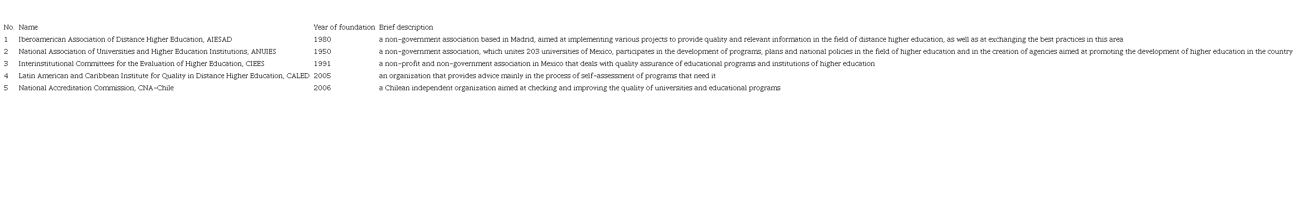 The subsequent analysis has made it possible to compile a similar list of Latin American organizations working on quality standardization in the field of e-learning (Table 3).