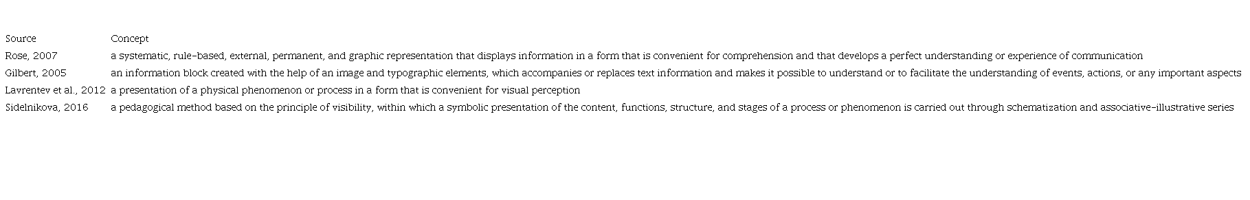 A.A. Zakharova and A.V. Shklyar (2013) note that the main task of visualization should be considered to be the creation of an additional, sometimes a single opportunity for the accelerated understanding of a certain amount of information. K.V. Kiuru and E.E. Popova (2018) examine the use of digital visual content in the educational process of a higher education institution and note that visualization is a response to the challenges of modern social reality which makes it possible to individualize the educational space. According to Z. N. Kodzova (2017), structuring, schematization, and, most importantly, compression of educational material (the volume of which increases constantly) are implemented only because of the use of a large number of visual means in the educational process.