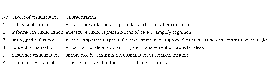 One of the most detailed classifications of visualization tools belongs to R. Lengler and M. J. Eppler (2007). It is presented in the form of a periodic system and includes 6 main groups, classified according to the object of presentation (Table 2).