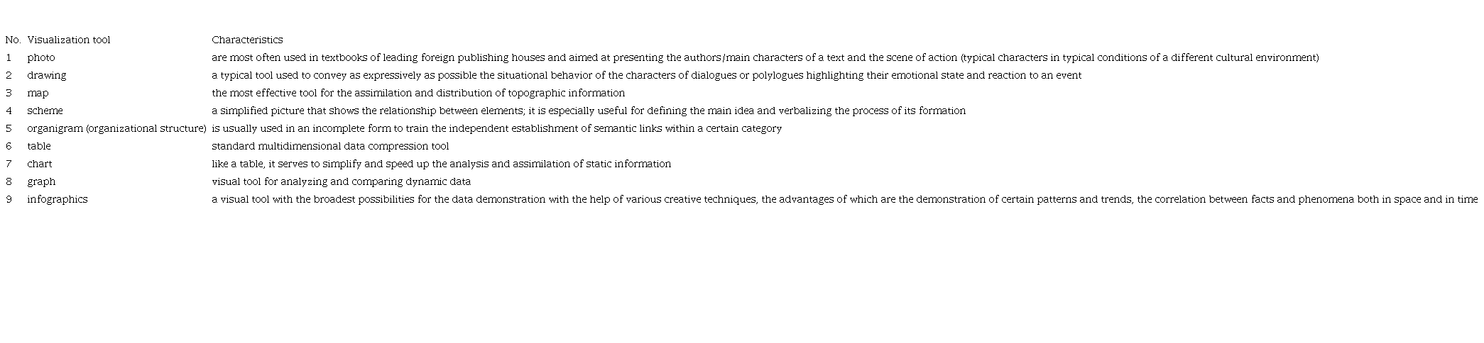 The researchers focus on the use of typical visualization tools in English language learning (Table 3) (Izotova & Buglaeva, 2015; Syrina, 2016).
