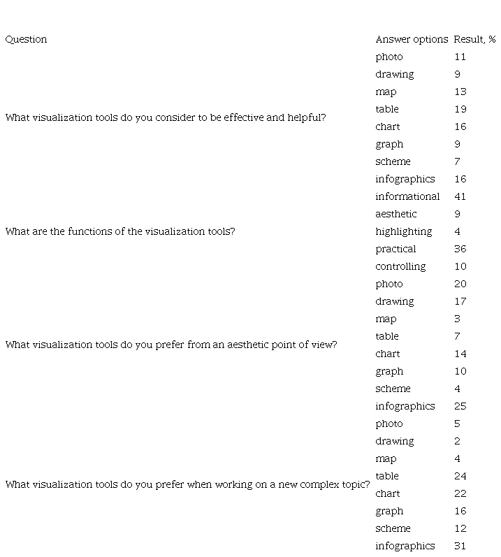 - a survey was used, firstly, to determine the types of visualization tools that simplify distance learning, and which, on the contrary, are perceived as difficult to understand. Secondly, it was used to determine the steps of the visualization process and to give examples of the use of visualization of the educational material in the course of English.