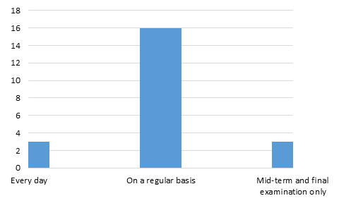 With reference to the frequency of assessment, 72% of participants prefer to assess students “regularly.” In contrast, only 14% or the respondents consider assessing students “every day” and through “mid-semester and final examinations only”, as seen in Figure 1. Nevertheless, the frequency of assessment was not clarified in the questionnaire as EMI teachers express, they assess students in a “continuous way.” However, the fact that the teachers assess the students´ work in a continuous way does not imply that they follow a formative assessment approach: