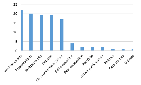Among the assessment tools, the most usual ones among EMI teachers are written exams (100%), oral presentations (91%), written works (86%), debates (86%) and classroom observation (77%). As for the latter, which is highly rated, most of the teachers clarify that this is considered as “participation” according to the University particular assessment standards. In contrast, few teachers use self-assessment (18%) and peer-assessment (9%) techniques. Since the assessment criteria are pre-determined by the University itself, teachers have no “voice” about the weight of the examinations on the final grade: