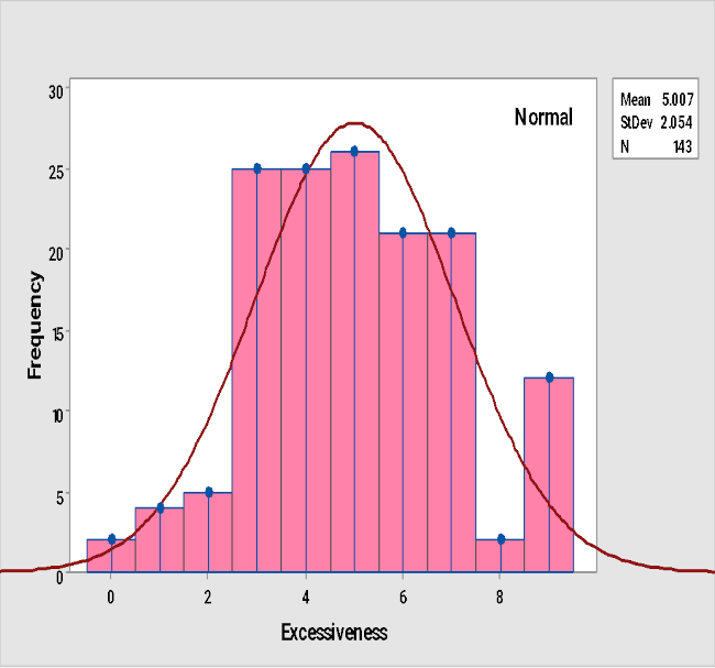 The score distribution of the 143 teacher-respondents on the five constructs of cyberchondria showed a normal distribution which indicates that the data gathered was statistically correct. The excessiveness (see Fig. 2c) construct obtained the highest mean score of 5.01 with standard deviation of 2.054 while the compulsivity (see Fig. 2a) construct got the lowest mean score of 2.45 with standard deviation of 1.787. This is consistent with the previous result indicating that the excessiveness construct had the greatest impact on the teacher-respondents, that is, they search for health-related symptoms over and over again in the internet. These results corroborate the findings of the study of Dagar, Kakodkar & Shetiya, (2019) where in fact all of their computer engineering student-participants are affected by excessiveness construct of cyberchondria.