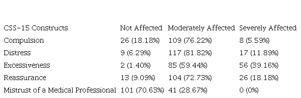 The CSS-15 (with 15 items) administered to the teacher-respondents was originally CSS-33 (with 33 items) constructed by McElroy & Shevlin (2014) and it was based on a solid theoretical framework, with very good to excellent reliability and validity. This instrument has been translated into several languages over a period of time (e.g., Silva, Andrade, Silva & Cardoso (2016)) made a translated version of CSS that has semantically adapted for the Brazilian population). The revisions of the original version of the CSS have been introduced to refine its conceptual foundation and improve its utility by making it shorter, hence this study utilized the shorter version CSS-15 but retained its good psychometric properties similar to CSS-33. The CSS-15 contains five (5) constructs, namely, compulsion, distress, excessiveness, reassurance and mistrust of a medical professional. Each of these constructs contains three (3) questions. The next table shows the attributes of the different constructs: