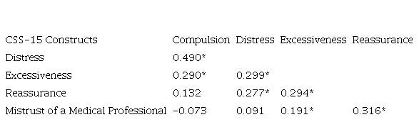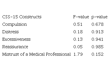 The information showed in table 3 shows the association of the CSS-15 constructs. The association between distress and compulsion showed the highest magnitude and significant correlation however their association is not strong which indicates that distress and compulsion indicators of cyberchondria are related but not very high. This is an important indication that these constructs are independent domains which particularly measures independent characteristics of cyberchondriasis. Other constructs showed weak positive correlations except for the no linear association between the mistrust of a medical professional and compulsion as well as distress which indicates that these variables are independent.