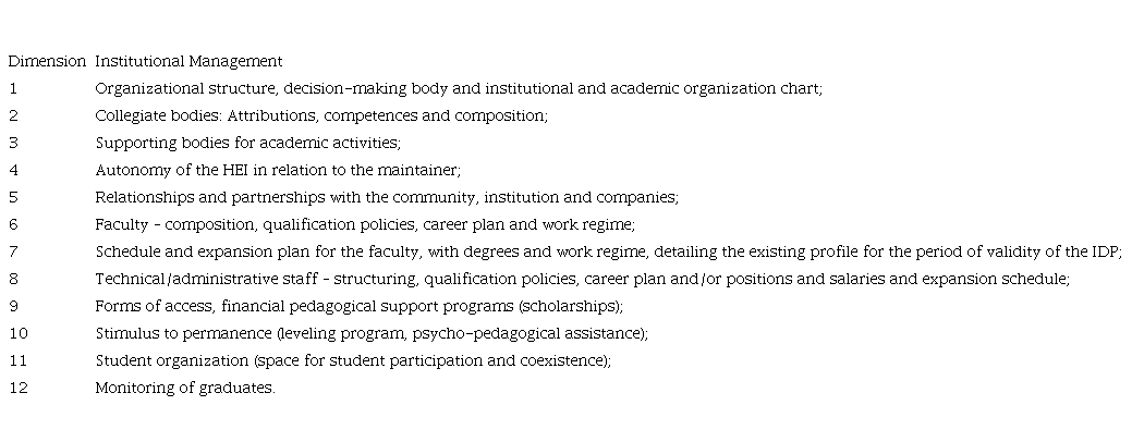 The Ministry of Education (MEC), through the Process Monitoring System of Higher Education Institutions (SAPIENS/MEC), published a document intended to serve as a reference for the construction of the IDP, answering doubts and questions from the HEIs (Dal Magro & Rausch, 2012). Thus, the preparation of the document must meet the following dimensions: institutional profile, institutional management, academic organization, infrastructure, financial and budgetary aspects, evaluation and monitoring of institutional development and annexes.