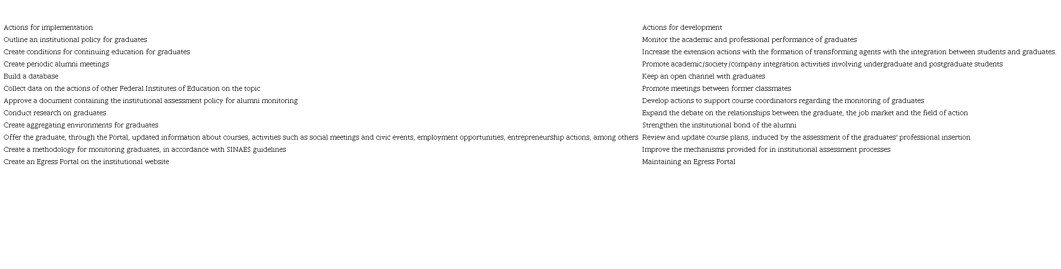The information collected in the table with the main data obtained from the universities' websites is presented below, showing an overview of how these institutions present the information to the general public in their IDPs, and how they plan to develop actions and goals for the topic. Table 2 describes the actions proposed by the Federal Universities of the Southeast region to monitor their graduates: