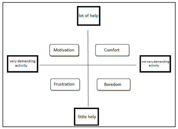 And to solve this dilemma, Coral & Lleixà (2014) used, in an adapted way, Gibbons' (2009) quadrants, which relate cognitive-communicative challenges and linguistic aids in the teaching environment. The figure below represents the feeling the students would get from the activities.