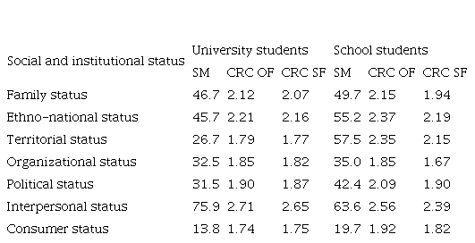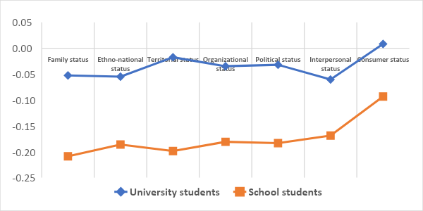 The difference between the coefficients of social fluctuation and object field of role choice in school students shows that youth have weak role connections with their institutional status. This suggests that school students do not fully identify the social role they choose with their social status. School students’ institutional status-role preferences are intuitive and formalized. They are guided by the standard of the social status models offered to them. University students, on the contrary, correlate the role choice with the institutional status, therefore, their social identification is more obvious (Figure 1).