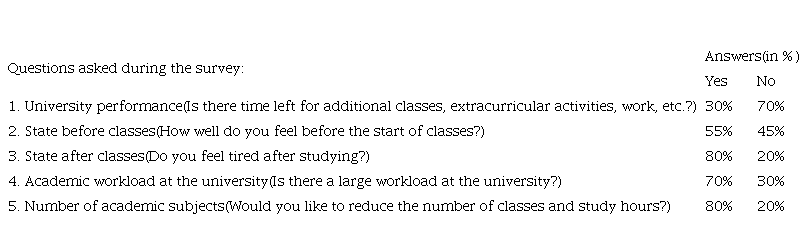Students point out several reasons for this: many students experience a lack of time due to intensive study and feel overloaded. Most of them would like to reduce the number of academic subjects and have a more optimal study schedule. Sometimes study begins after lunch or in the evening, and because of this, not everyone can combine some clubs and work. There are some reasons for this: mental activity is at its highest level in the morning than in the afternoon. All these factors affect both academic performance and health. The state achieves the highest indicators after classes. Students experience severe stress after studying and want to reduce the number of academic subjects. The students show the lowest performance indicators at the university, which means that students do not cope with the academic workload.