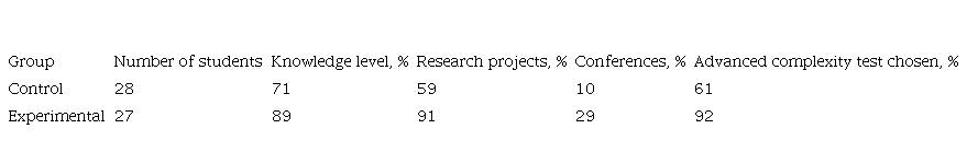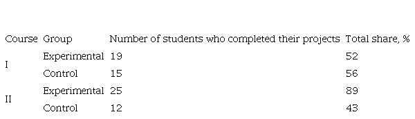 Table 1 shows the percentage of the students by the quality of knowledge, preparing projects, presenting at seminars and student conferences, and completing an advanced complexity test. These results give reason to believe that the use of a set of methodological techniques of modular learning in math classes exerts a positive effect on the quality of student learning, their attitude to additional classes, and the formation of their independent creativity.