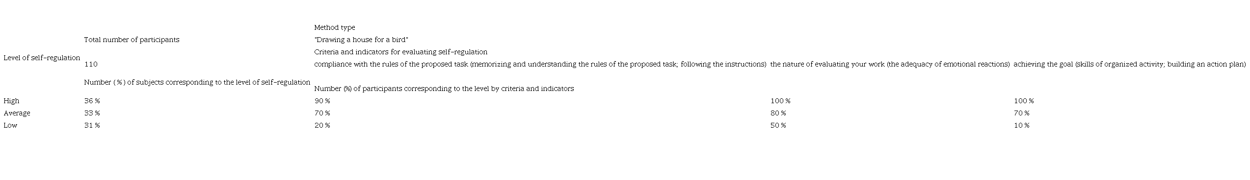 31% of the participants were attributed to the low level of self-regulation. This group was characterized by insufficient memorization and understanding of the rules of the proposed task, followed by the lack of organized activity skills and difficulties in planning. Also, the children of this group had manifested some lack of adequacy in emotional reactions when assessing their own performance - half of the children liked their drawing; the rest resorted to a negative assessment.
