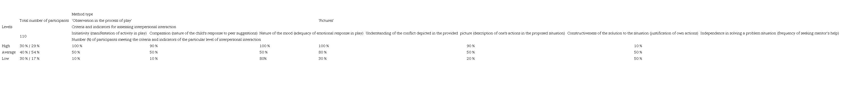 The modification of the first technique included specifying the goal, determining the criteria and indicators for assessing children’s interpersonal interaction, developing the content of the levels of this interaction, and developing the form of the research protocol. The purpose of applying this technique was to identify the interpersonal interaction of 6-7 year-olds.