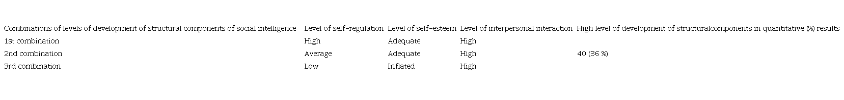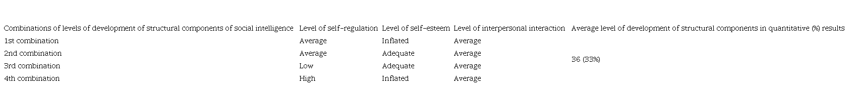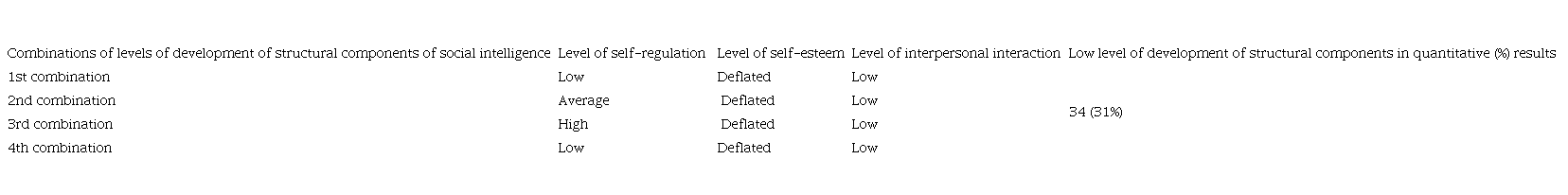 One-fifth of the participants (20%) were attributed to a low level of interpersonal interaction, 31% - to a low level of self-regulation, and 30% - to a low level of self-esteem. Consequently, low levels of self-regulation (31%) and self-esteem (30%) also provide a correspondingly low level of social intelligence in general (31%).