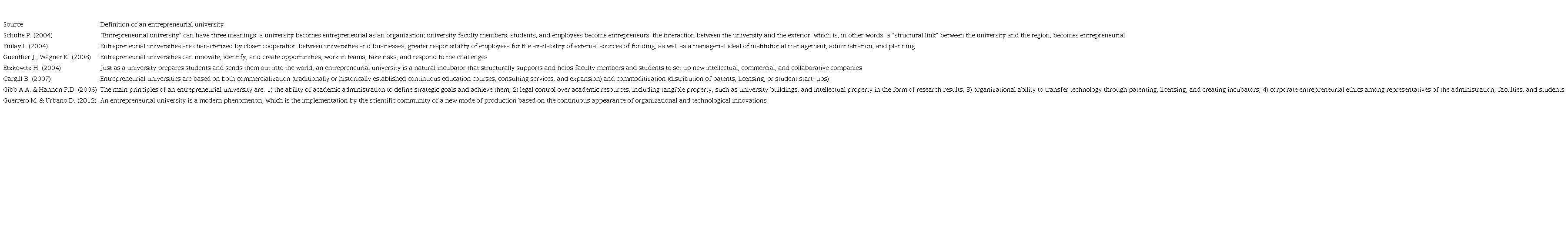 Let us consider the most frequently used definitions of the concept of an entrepreneurial university, introduced by scholars and specialists in university entrepreneurship (Table 1).