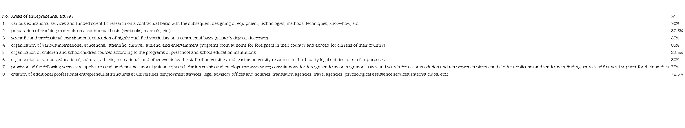 The experts noted that the following may become the areas of university entrepreneurial activity (Table 2).