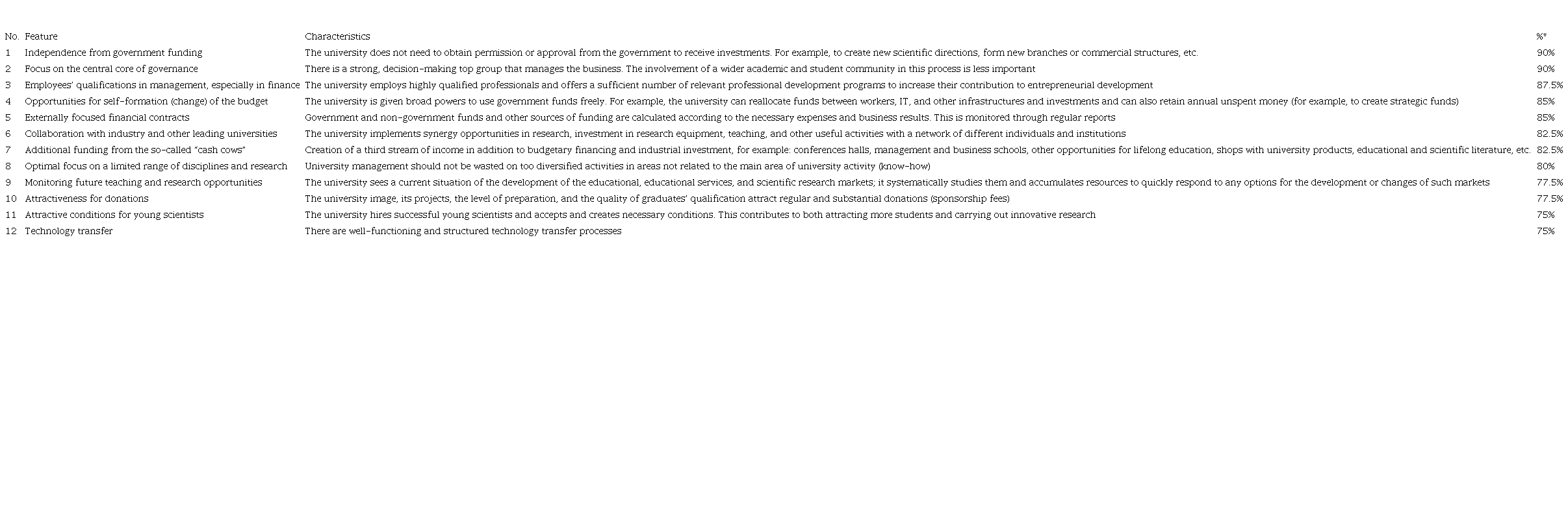 Based on the expert survey, the following main features of an entrepreneurial university were identified (Table 3).