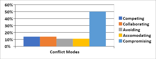 Analysis of the data according to the Thomas-Kilmann Conflict Mode instrument revealed the following: such a strategy of behavior as Compromising (50%) in a conflict situation is chosen most often, i.e. these people somewhat lower their requirements, concede in their interests to others. As a result of the counter movement, each of the parties achieves a partial satisfaction of its desire and a partial fulfillment of the desire of the other party.