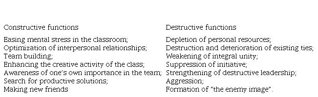 With a responsible and competent attitude to a conflict situation, according to L. Koser’s concept of a positive-functional conflict, a pedagogical conflict could perform not only destructive, but also constructive functions for each of the participants in the conflict interaction (Coser, 2007).
