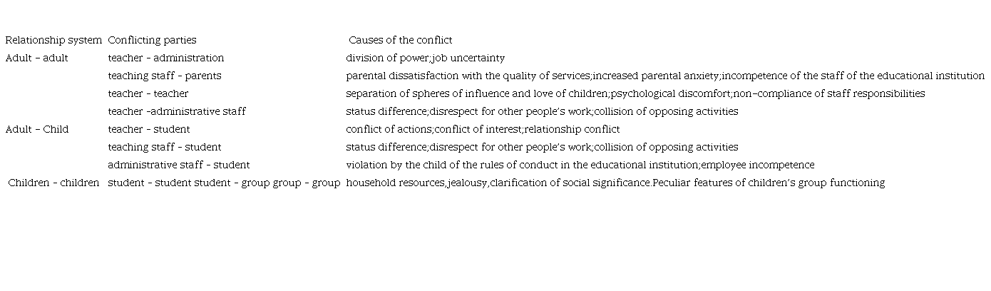 The work of Yu.L. Astakhova (2013) reveals the causes of interpersonal conflicts in the teaching staff of an educational institution. According to the researcher, the main causes of pedagogical conflicts include: high demands on the teacher from the educational system (the professional activity of a teacher requires great intellectual, emotional and mental costs); high requirements for the teacher from the parents (teacher’s role in the educational process); low communication culture among teachers, etc.