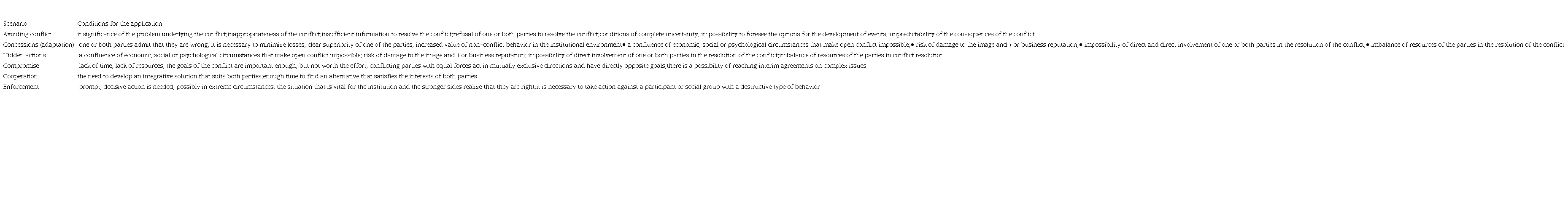 The development of conflictological competency of the head of an educational institution would be more effective when the following groups of conditions are created (Blinova et al., 2018): - institutional and managerial conditions, including the regulatory, documentary, material and technical support for the development of conflictological competency; - personnel conditions, implying the support of the development of conflictological competency by appropriate qualified professionals (a psychologist, a conflictologist, a mediator); - technological conditions that make it possible to determine the criteria for assessing the level of conflictological competence; - psychological and pedagogical conditions, including developing technologies for conflictological training of participants in educational relations and organizing methodological support for the conflictological training.