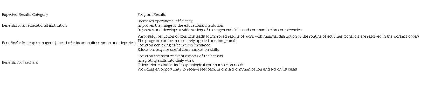 The purpose of the program: to provide methodological tools for successful resolution of conflicts arising in professional activities in order to optimize the process of conflict management in general educational institutions.