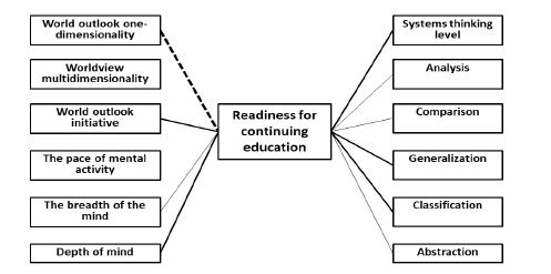 The research was conducted based on Universities in the Krasnodar krai of the Russian Federation implementing Programs of Higher Pedagogical Education. A total of 748 graduate students enrolled in the relevant training areas participated in the study. The diagnostic tools of the research are the author's questionnaire to identify students' readiness for continuing education, Methodology of Worldview Activity, Mental Performance and Type of Intelligence (Ryzhov, 2010), methods to identify the level of formation of thinking operations (Comparison of Concepts - comparison and generalization operations; Proverbs Interpretation - abstraction operations; Selection of Essential Features - generalization and classification; Complex Analogies - ability to identify complex logical connections), Evaluation Method of Thinking System (Sychev, 2009).