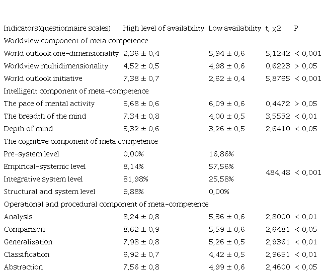 A comparative analysis of average group indicators of features and the level of meta-competence development (t-Student's Test) was conducted in two groups. Correlation analysis of empirical data (Spearman's rank correlation coefficient) was carried out on the total sample.