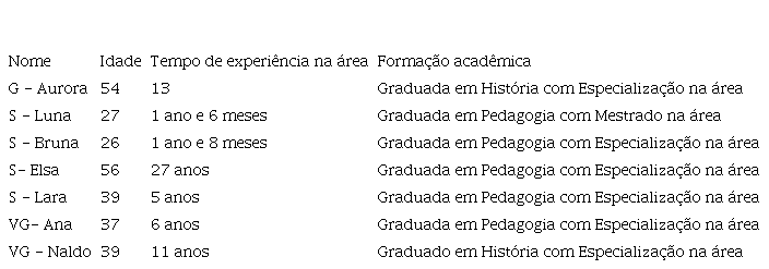 Em relação ao tempo de atuação, 66,7% possuem experiência acima de cinco anos na área, havendo somente dois dos profissionais (33,3%) com tempo inferior a dois anos. Outro dado observado é que 71,5 % são licenciados(as) em Pedagogia e 28,5% licenciados(as) em História. No total da equipe, 6 (seis) possuem especialização (85,7%) e somente1 (uma) possui Pós-Graduação Stricto Sensu (Mestrado) (14,3%).