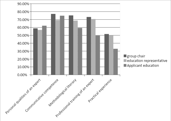 It will be advisable to pay attention to the personal qualities of an expert as one of the professional competencies. Thus, according to the results of the survey, it can be seen that only 58.8% of chairmen of expert groups have this competence, 56.9% - members from among representatives of education and 62.2% - from among applicants for higher education. The personal qualities of an expert include: criticality and heuristic, willingness to open and work in new situations for oneself, tolerance, the ability to decentrate, seeing the situation from different points of view, observation and sensitivity, intuition, tact, independence, adherence to principles, the ability not to succumb to pressure other people.