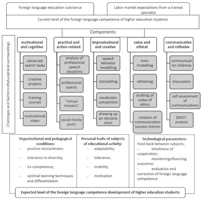 The scientific researchwas focused on the elaboration of an author's model of foreign language competence development ofhigher education students in the context of blended learning. The suggested model includes the following components (Figure 1): motivational and cognitive, practical and action-related, improvisational and creative, value and ethical, communicative and reflexive.